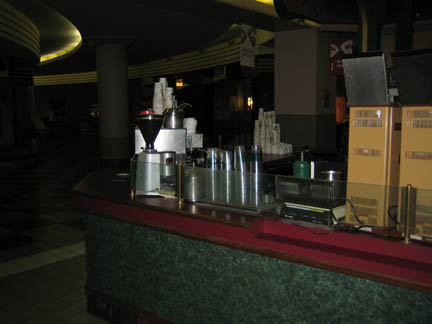As the weather was hot and *humid*, I took the Skyway back. This was late in the afternoon on Memorial Day. The downtown was deserted, but lo-- the Skyway was open! Accessable from any building. And the shop-filled route was just as deserted. It felt like "The Omega Man" What struck me was how little security there was. There were a number of stores where I could have reached in and taken any manner of merchandise or display. Maybe there were security cameras or something, but none that I could see. Here is a pic of a large coffee stand where the cups, coffee thermos bottles and equipment were just set out there in the open . Living in L.A. all this time I was wide-eyed with shock!