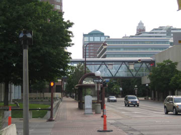 Des Moine's Skyway The downtown area had second floor walkways similar to the ones I experienced in Minneapolis. I think these are neat: they're almost like another world, with shops and a unique environment with different sections having their own flavor. Unlike Mpls's skyways, however, the City of Des Moines owns these and they are required to be open 24/7.