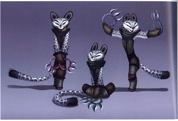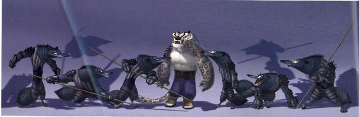 As I suspected, there were a large number of characters/character designs in early drafts: sheep and goat villagers; a bunch of thugs , including gazelles, *wolves* and big cats ( ninja snow leopards!! ) in Tai Lung's gang (an evil army that was dropped); and of course, tons of pandas! (<--just for you, Jen!)