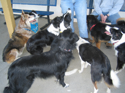 Today was the Border Collie Rescue Christmas party. Border collies galore! Every age, size, color and personality was represented there: B&W's, browns, merles, smooth and rough (and semi-rough), split-faces and mixes. Old fatties and young turks, hard-eyed and couch potato. I had been looking forward to this for a long time: an excellent opportunity for Rondo to socialize with other border collies.