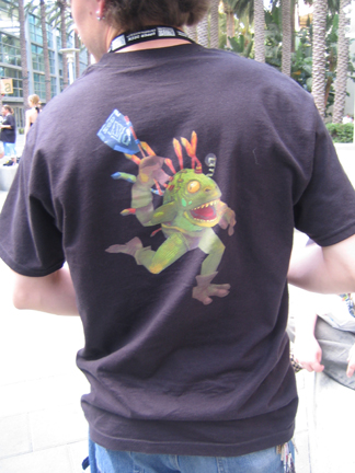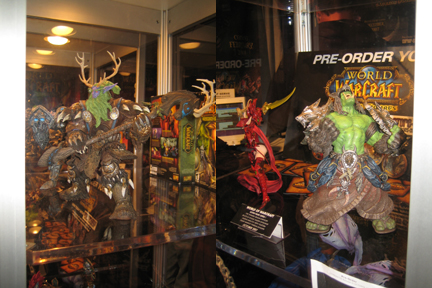 Tons of people there eager to try the new expansion for the Warcraft : the lines for those terminals was always huge. As opposed to the terminals for the new Starcraft (2) game, for which there were always available terminals. No dealers to speak of, with the exception of a few selling WoW licensed stuff. Lots of cool art-figures based on the card game. There was an Nvidia booth, WoW collector card booth and even a company that lets you get credit cards with Warcraft art on them (warning: a 500k image). The Blizzard Store was pretty sold out of everything by Saturday (like the cool murloc shirt ), but I did get a set of baby murloc figures and a t-shirt (that I ended up trading with Roz).