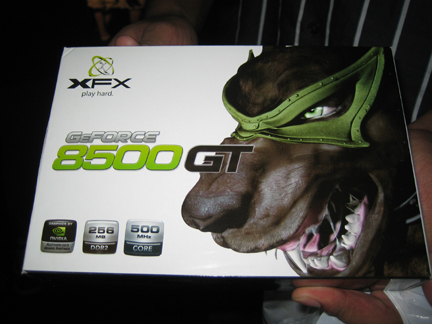 There were a lot of exhibitors there, most having mini-contests for bling. Nvidia had a "match the number on a button" contest that won you a bag of swag, including this graphics card with the cool wolf-thing on the front !