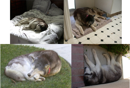 Clockwise from upper right: Frieda's spot: under the laundry room counter, next to her dog-door; outside on a cool spot on the walk; shady patch in the grass; a comfy bed, especially if she thinks she's not supposed to.