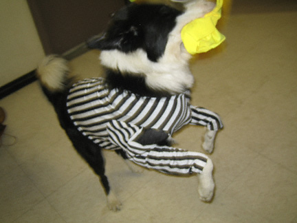 Huge thanks and props to Elayne for taking a Friday night off to sew this up! And Rondo was SOOoooOooo tolerant about this. He seemed to enjoy the attention (thank goodness) and fistfulls of people-food didn't hurt either. Here's Rondo in action!